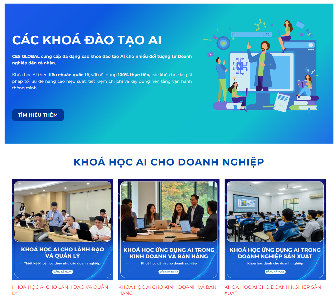 Không chỉ cung cấp công nghệ, CES Global còn phát triển Online Executive Training Series: AI Transformation for Enterprises - chuỗi đào tạo trực tuyến dành cho doanh nghiệp, tập trung vào ba nội dung chính: Xây dựng tư duy và chiến lược AI cho lãnh đạo; Phát triển đội ngũ nhân sự số và tự động hóa quy trình vận hành bằng AI, giúp doanh nghiệp từng bước ứng dụng AI hiệu quả trong thực tiễn.